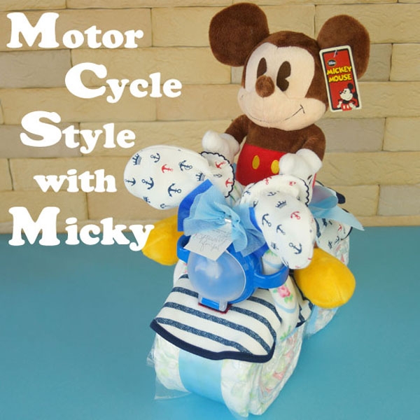 おむつケーキHOME > スイートリボン コラム > 商品開発秘話 スイートリボンダイアリー > オムツケーキ即日発送商品に人気のディズニーバイク登場!!