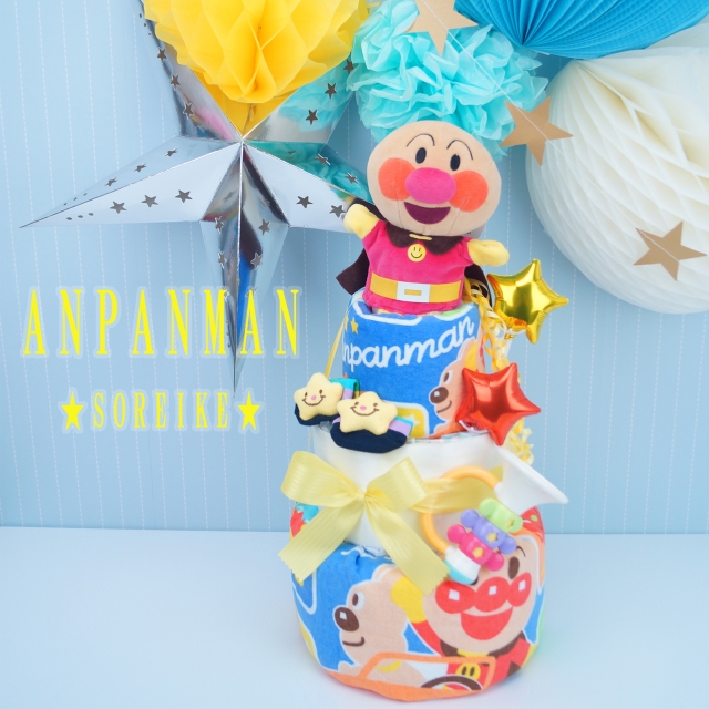 おむつケーキHOME > お届け日で選ぶ(お急ぎ発送【1~3日営業日で発送】) > それいけ!!アンパンマン3段オムツケーキ【送料無料】