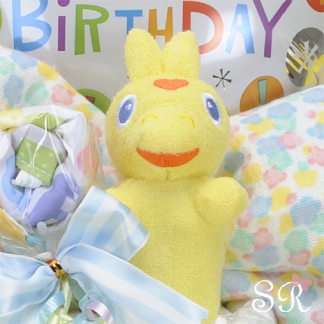 カラフルな色合いがかわいいロディの3段オムツケーキ(ブルー色)です。ロディのラトルがコロン♪コロン♪と鳴ります。また、赤ちゃんが好きな「ガシャガシャ音」が出るおもちゃもついて楽しめます。