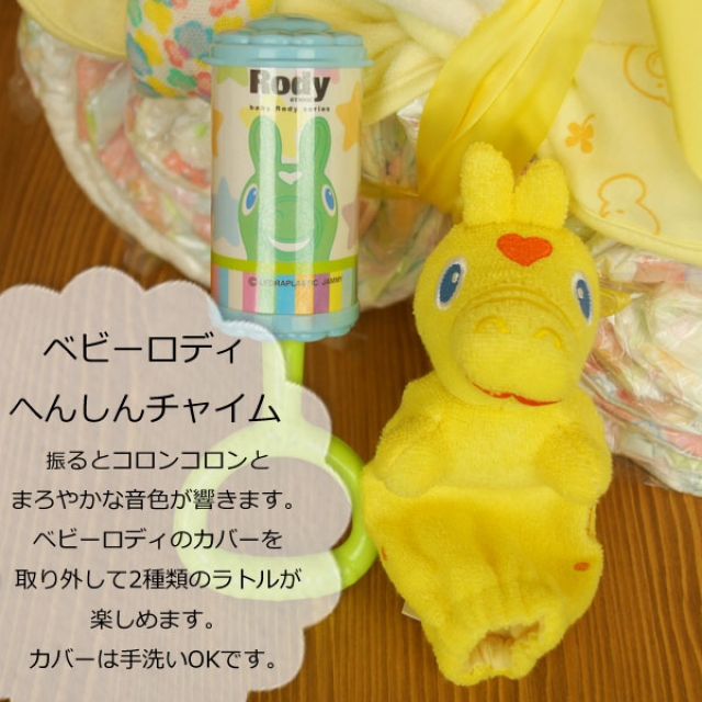 カラフルな色合いがかわいいロディの3段オムツケーキ(ブルー色)です。ロディのラトルがコロン♪コロン♪と鳴ります。また、赤ちゃんが好きな「ガシャガシャ音」が出るおもちゃもついて楽しめます。